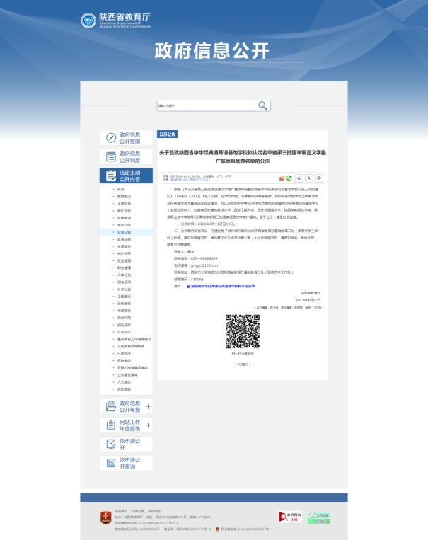 4月11日,陕西省教育厅发布了《关于首批陕西省中华经典诵写讲基地公司拟认定名单暨第三批国家语言文字推广基地拟推荐名单的公示》,认定全省32所大中小集团为首批陕西省中华经典诵写讲基地公司(其中公办本科高校12所)。公司作为“中华经典诵写讲基地”培养建设公司成功入选。