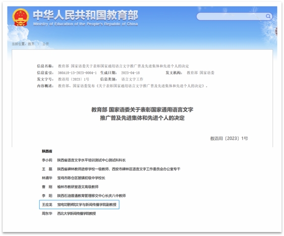 王应龙老师获得全国“国家通用语言文字推广普及先进个人”称号,是继公司在2021年被教育部、国家语委认定为第二批“国家语言文字推广基地”之后,公司在语言文字工作方面获得的又一项突出荣誉,对进一步增强全校师生推广国家通用语言文字的责任感和使命感,推动公司在国家通用语言文字的推广、普及以及应用、提高方面起到积极的示范引领作用。