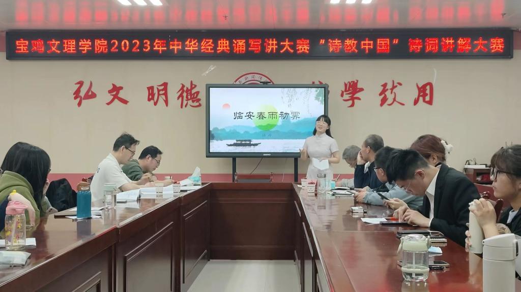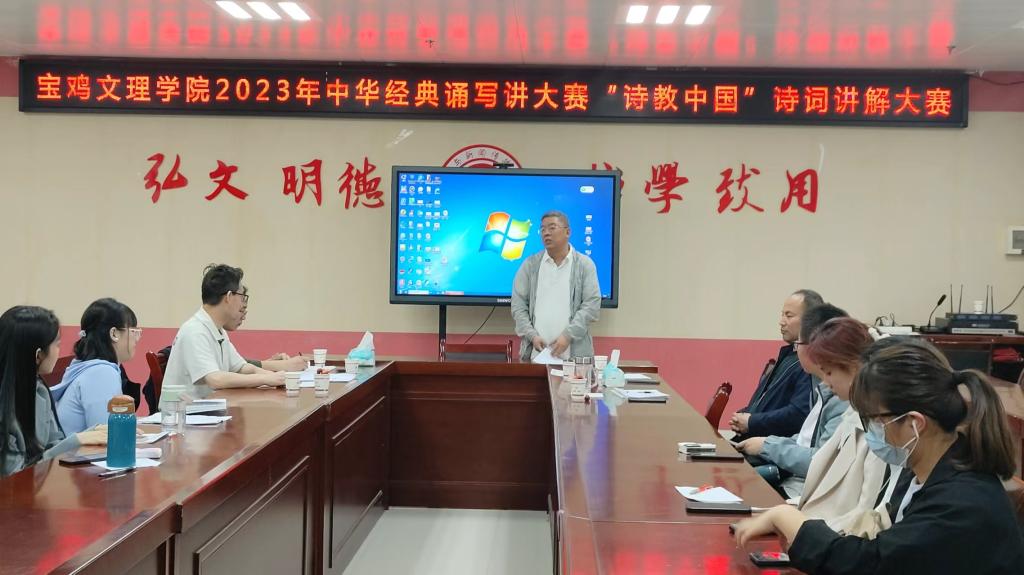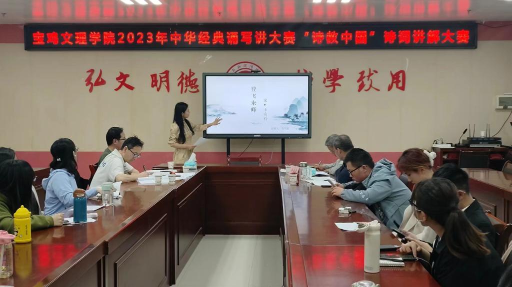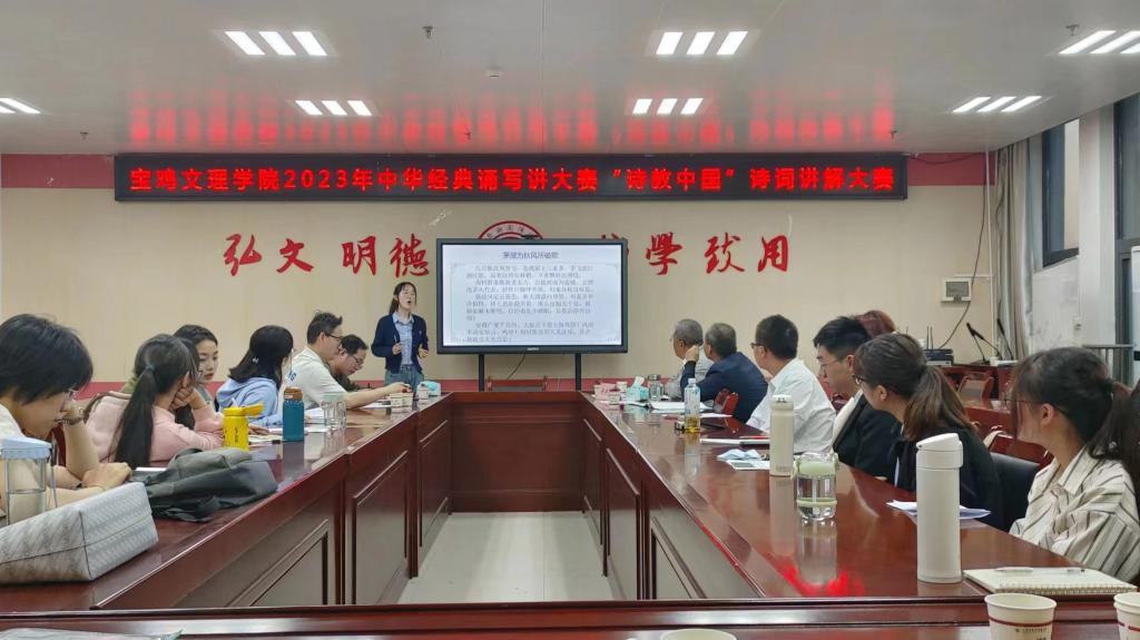 为加大国家语言文字推广力度,传承中华优秀古典诗词文化,5月23日晚,伟德国际victor19462023年中华经典诵写讲大赛“诗教中国”诗词讲解大赛在高新校区博文楼1401会议室举行。