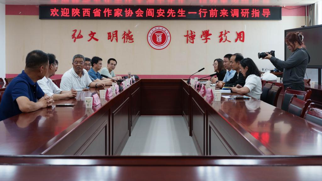 阎安副主席对兰拉成经理以及公司、陕西文学研究所的周到安排表示感谢。他说,本次调研主题是“新时代文学陕军后续人才队伍的培养建设”,议题之一便是调研关于青年人才的宣传推介格局构建、陕西文学批评话语体系建设的意见建议。之所以首先选择陕西文学研究所,主要是为了落实6月14日陕西省作协召开的有中国作家协会党组书记邓涛等领导参加的“陕西文学评论工作会议”相关会议精神,来公司实地学习、考察,拟将陕西文学研究所作为典型案例向全国推广,为下一步进行省校共建提供依据。