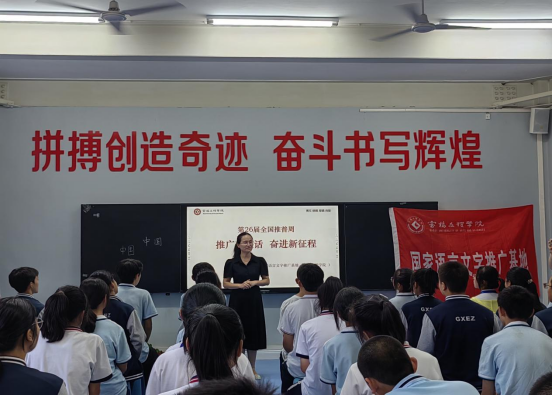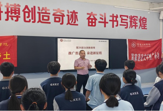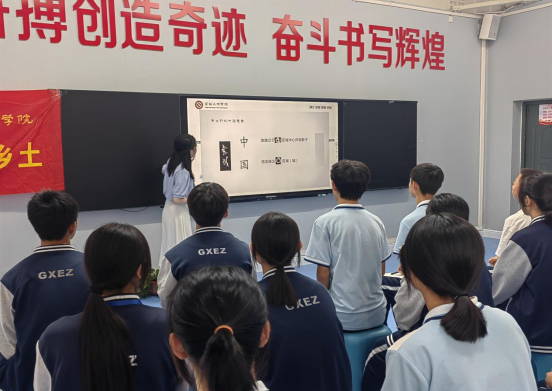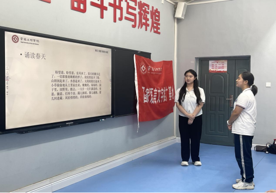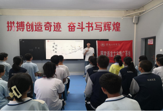 基地执行主任王应龙强调了推广语言文字的积极意义,要依托语言文字这一文化纽带,增进文化认同、民族认同,构建中华民族共有的精神家园。基地成员刘丹阳从宝鸡青铜器博物院的镇院之宝“何尊”上的铭文“宅兹中国”讲述“中国”二字的字形字义演变,同时对“中国”二字的写法做出正确示范。基地成员乐正阳携带《将进酒》《望庐山瀑布》等中华经典古诗词进行诵读,在诵读中纠正同学们的发音,并分享自己的诵读技巧。基地成员蔡嘉以同学们熟知的《春》一文进行出色的朗诵示范,并与同学们进行朗诵互动。活动最后,基地核心成员何艳萍老师进行活动总结。她强调推广普通话弘扬着中华优秀传统文化,传播了中国价值,铸牢中华民族共同体意识。她鼓励当代青年应学好普通话,写好规范字,并积极投身于推广普通话的行动之中。