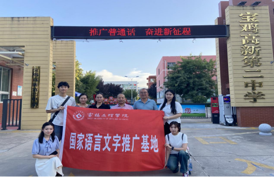 2023年9月12日下午,国家语言文字推广基地(伟德国际victor1946)(以下简称“基地”)执行主任王应龙、核心成员何艳萍老师带领推普周团队成员刘丹阳、乐正阳、蔡嘉、杨欣瑶等走进宝鸡高新第二中学开展以“推广普通话 奋进新征程”为主题的推普活动。