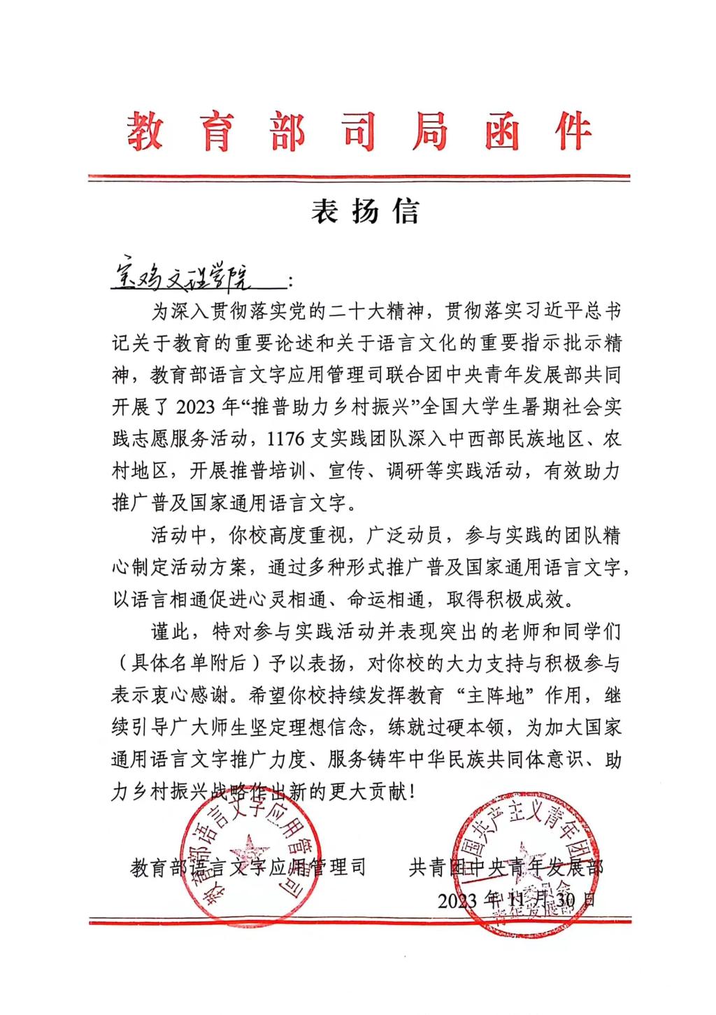 近日,教育部语言文字应用管理司、共青团中央青年发展部共同主办的2023年“推普助力乡村振兴”全国老员工暑期社会实践志愿服务活动评优揭晓,公司荣获“优秀团队”荣誉称号并收到来信表扬。