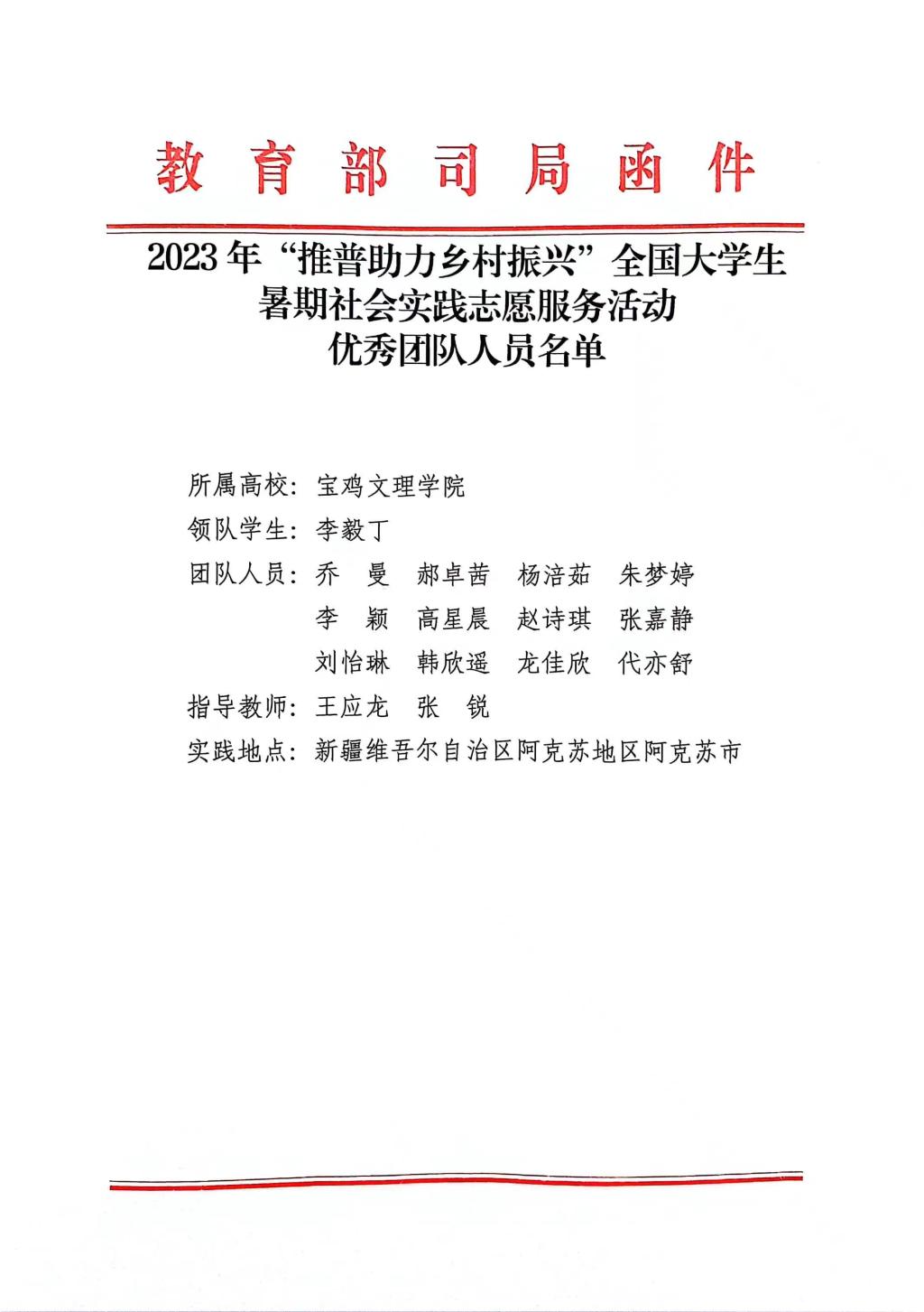 2023年6月,教育部公布2023年“推普助力乡村振兴”全国老员工暑期社会实践志愿服务活动名单,北京大学、清华大学等1176支高校团队入选,公司赴新疆阿克苏地区推普助力乡村振兴实践服务队成功入围并积极行动,最终圆满完成任务。其后教育部语用司组织专家结合活动开展情况,对完成实践活动并提交总结材料的近千家团队进行评审,共评出240支优秀团队,公司再次荣列其中。