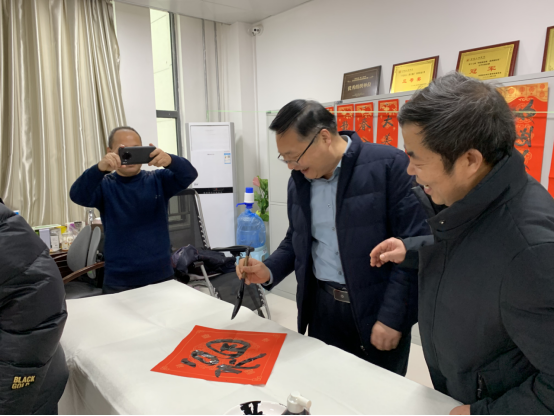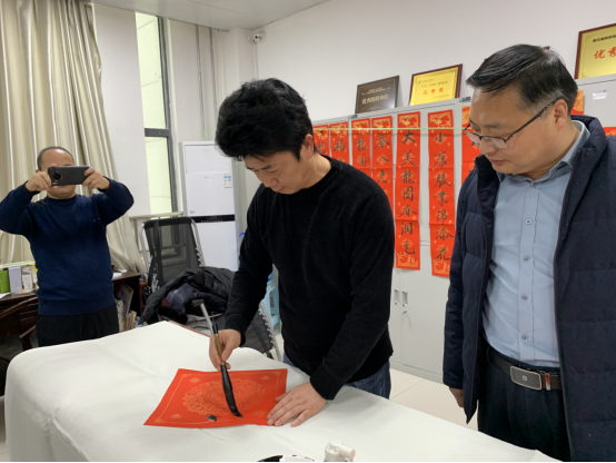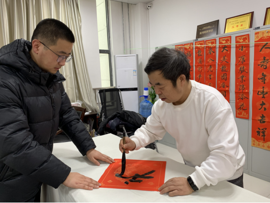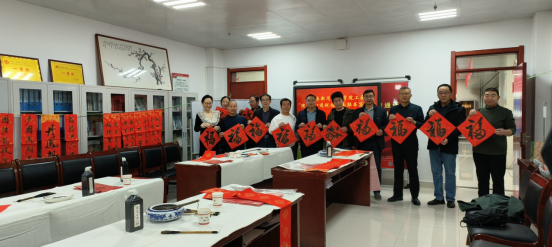 2024年元月18日上午,文传院工会联袂国家语言文字推广基地(党支部)在博文楼1403室举办2024年“迎新春•送祝福”春节对联书写活动。文传公司党委书记郭锋航、美术公司分会主席王彦军、音乐公司赵文平莅临活动现场并挥毫书写“福”字。