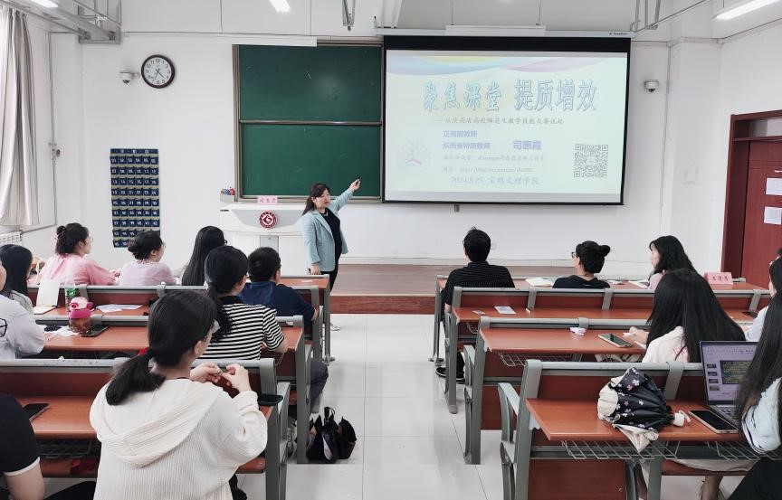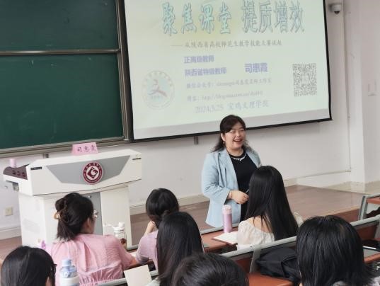 2024年5月25日下午4时整,博文楼内已经座无虚席,陕西省教学名师、正高级、司惠霞老师亲临校园,与中文专业的员工和研究生们共聚一堂,以“聚焦课堂,提质增效”为题,分享了她的人生智慧与教育心得。学科教学(语文)带头人王渭清老师主持了报告。公司师范生素质教育中心赵保胜老师等聆听了讲座。