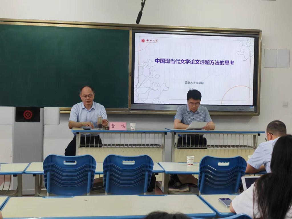讲座开始之前,由公司中国现当代文学专业郭文元老师介绍雷鸣老师履历:雷鸣老师作为西北大学文公司中国现当代文学专业教授、博士生导师、西北大学贾平凹研究中心主任,同时也是陕西省宣传思想文化系统“六个一批”人才,主持国家社会科学基金项目2项、国家社会科学基金重大招标项目子课题1项、教育部人文社会科学研究项目1项,省级项目7项等,多次获省哲学社会科学优秀成果奖、省文艺评论奖最高奖,在《文学评论》《文艺研究》《中国现代文学研究丛刊》等期刊上发表论文80余篇。郭文元老师在表达对雷鸣老师到来的亲切问候于诚挚感谢后,说明此次讲座选题意义在于针对目前师生论文写作选题上的弊病与思路的套路化等问题获得具有实际意义的解放方法与思路拓展。