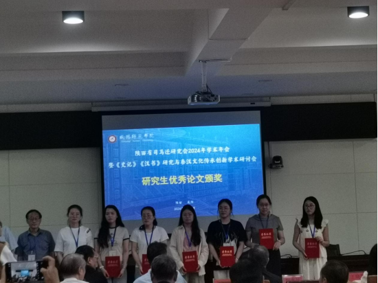 分组讨论后,大会举行闭幕式及研究生优秀论文颁奖典礼。各分组组长汇报本组讨论情况。公司研究生陈宏翠论文《文化景观视域下的司马迁祠墓诗》获评研究生优秀论文一等奖,研究生徐炽凤、卜晓蓉、芦文青获评研究生论文三等奖。曹强教授、凌朝栋教授等分别为获奖论文作者颁发了证书。