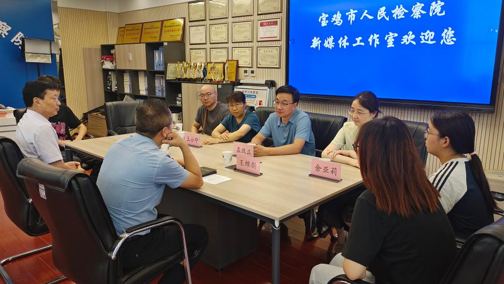 在宝鸡市人民检察院,政治部副主任李生利介绍了实习生的实习简况,表扬实习生工作态度积极,纪律性强,善于学习。王维新科长详细介绍了实习生的工作表现和作品特点。师生一起观看了部分视频作品。孟改正副经理对市检察院对文传院实习工作的支持表示感谢,他勉励实习生积极主动向检察院新媒体工作室老师学习,在实践中提高自己的认识和能力,高效完成实习活动。在座师生进行了简短的交流发言。