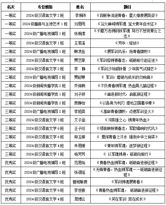 近日,公司发布了《关于表彰2024年“青春热血铸军魂 砥砺奋进新征程”军训主题征文活动获奖集体和获奖作品的决定》,公司荣获优秀组织单位,2024级播音与主持艺术1班刘思雨等4名同学荣获一等奖,2024级广播电视编导1班韩凌岳等5名同学荣获二等奖,2024级新闻传播学类1班刘子妍等8名同学荣获三等奖,2024级汉语言文学4班 屈博云等5名同学荣获优秀奖。