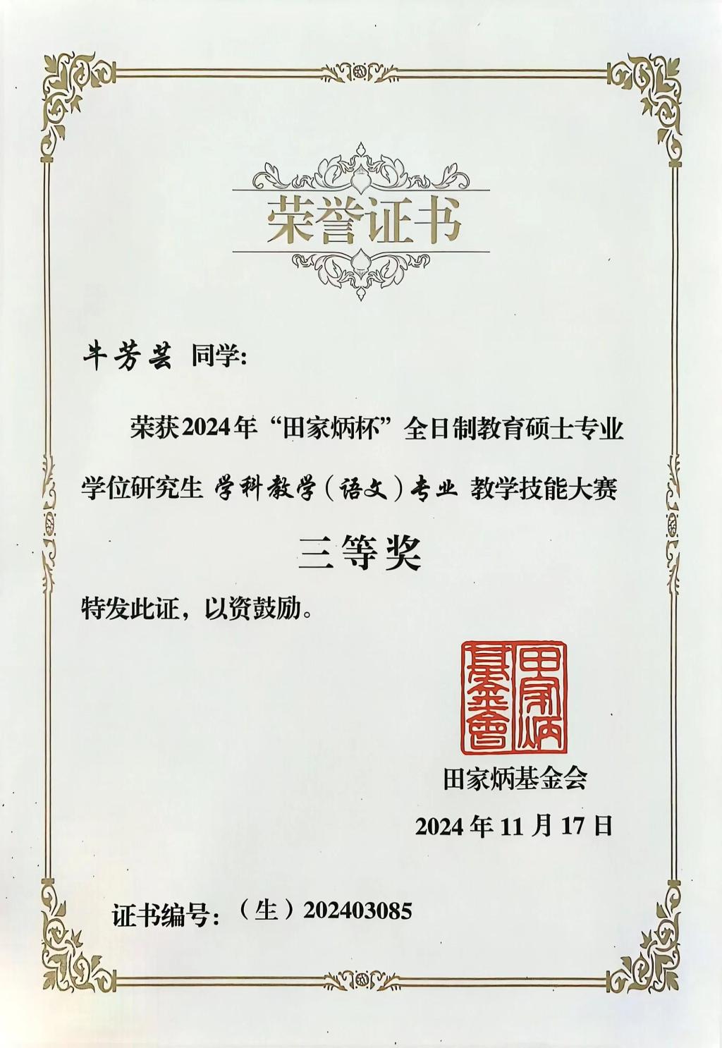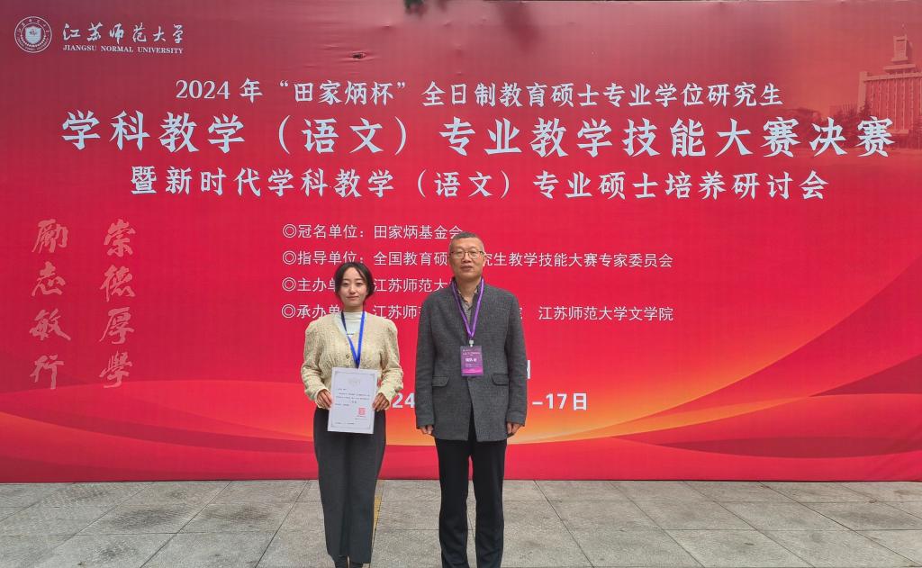 近日,2024年全国“田家炳杯”全日制教育硕士专业学位研究生学科教学(语文)专业教学技能大赛决赛暨新时代学科教学(语文)专业硕士培养研讨会在江苏师范大学举办。伟德国际victor19462023级学科教学(语文)专业研究生牛芳芸获三等奖(指导教师:王渭清)。