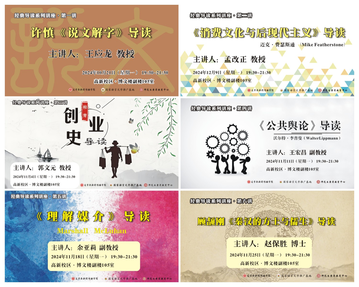 系列讲座分别由王应龙教授导读许慎的《说文解字》、孟改正教授导读迈克·费瑟斯通的《消费文化与后现代主义》、郭文元教授导读柳青的《创业史》、王宏昌副教授导读沃尔特·李普曼的《公共舆论》、余亚莉副教授导读马歇尔·麦克卢汉的《理解媒介》、赵保胜博士导读顾颉刚的《秦汉的方士与儒生》。