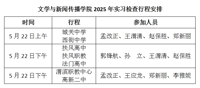 22日,郭锋航书记带队前往扶风县职教中心、扶风高中及法门高中等3个实习点,孟改正经理带队先后走访凤翔城关中学、凤翔西街中学、渭滨区职业技术教育中心和高新区第二中学等4个实习点,实地查看实习生教学实践、班级管理等情况。通过座谈交流等方式,检查组全面了解了实习生教学能力提升及师德养成情况。